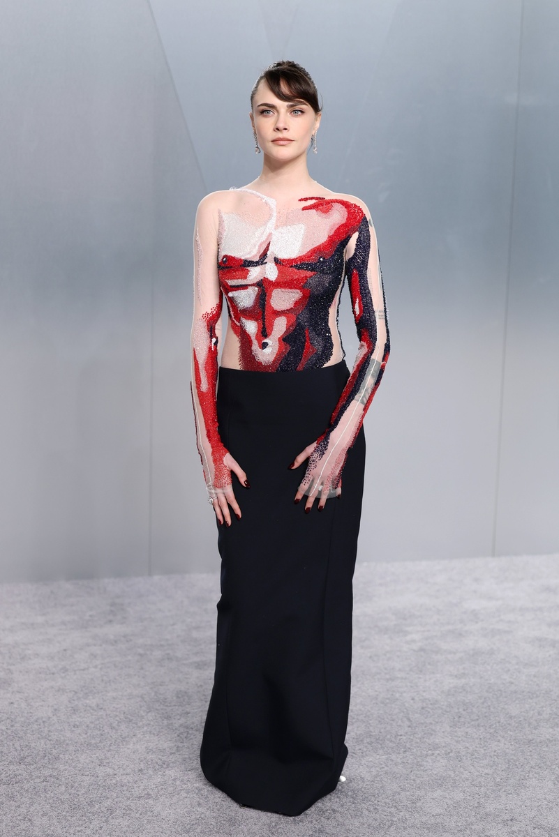 Самый необычный образ на этом вечере продемонстрировала Кара Делевинь, которая была в Thom Browne. Весь верх