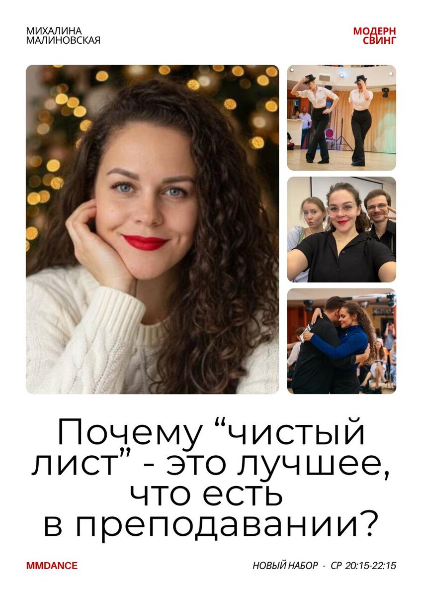 ? 🧡 "Часто меня спрашивают коллеги: «Не надоело ли тебе работать с новичками? Это же база, база, и снова база…». И я всегда отвечаю: нет, это мое любимое! В MMDance я веду вест кост свинг уже 3 года, и знаете, что я поняла? Взрослые новички - это самые смелые люди на свете. Они приходят в зал, где у них может не получаться, где они чувствуют себя неловко и боятся наступить партнеру на ногу. И в этот момент происходит магия. Да, я люблю работать с новичками. Люблю потому что: У них нет «заученных ошибок». Они впитывают информацию как губка, и ставить им технику с нуля - одно удовольствие. Искренность эмоций. Когда у новичка получаются первые шаги - у него глаза горят ярче, чем огни на танцполе. Прогресс здесь видно лучше всего. Еще час назад человек не знал, куда деть руки, а сейчас он танцует под музыку. Это ли не чудо? Для меня WCS - это про диалог. И учить этому диалогу того, кто только учится говорить - большая честь. Спасибо вам, за то, что позволяете мне быть вашим провод