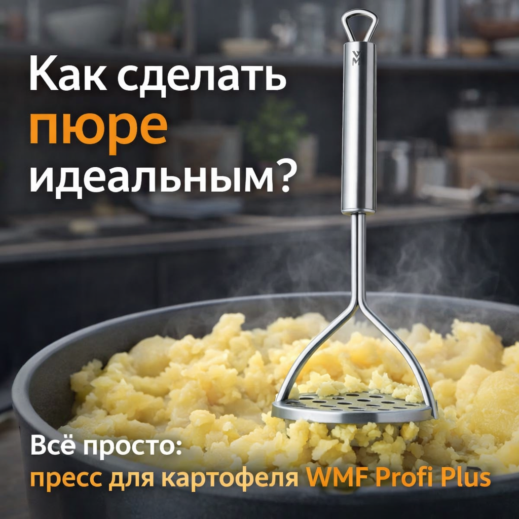 Признайтесь: у вас тоже пюре порой получается с комками? Не расстраивайтесь. Проблема не в вас, а в старой деревянной толкушке. Мы привыкли думать: «надо просто помять получше», «ещё немного», «сейчас дожму». Но правда в том, что обычная толкушка - это инструмент компромиссов с самого начала. Давление ложится неравномерно: один кусочек уже превратился в пасту, другой - упрямо держит форму. Плюс лишний воздух, который неизбежно вбивается в массу. В итоге пюре вроде бы вкусное, но «как в ресторане» - всё равно не выходит. Теперь представьте другой сценарий. Картофель спокойно, без борьбы, проходит через пресс - равномерно, мягко, без неожиданностей. На выходе - шелковистая, однородная текстура, которая даже без сливочного масла выглядит как комплимент от шеф-повара. Именно здесь в игру вступает пресс для картофеля WMF Profi Plus. Это не очередной «девайс, который пылится в ящике». Он сделан из качественной нержавеющей стали - можно смело отправлять в посудомойку. Оптимальная длина 28 см: