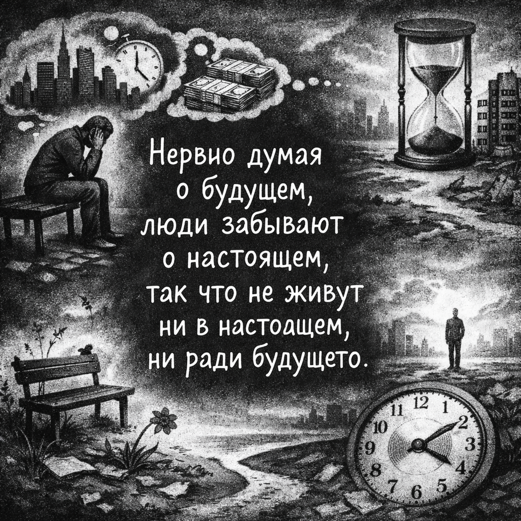Подписаться/Читать полностью Нервно думая о будущем, люди забывают о настоящем, так что не живут ни в настоящем, ни ради будущего Есть одна привычка, которую почти невозможно заметить сразу. Она кажется естественной, даже полезной. Люди думают о будущем. Планируют, переживают, прокручивают варианты событий. В голове всегда возникают вопросы: что будет дальше, как всё сложится, получится ли справиться, не случится ли что-то неприятное. На первый взгляд это выглядит как забота о собственной жизни. Ведь планирование действительно помогает двигаться вперёд. Без него сложно строить планы, принимать решения, создавать что-то новое. Но между спокойным планированием и нервным ожиданием существует большая разница. Когда мысли о будущем становятся постоянными, человек постепенно теряет связь с тем, что происходит прямо сейчас. Можно сидеть за столом, пить чай, смотреть в окно — и при этом мысленно находиться где-то далеко впереди. Ум начинает строить десятки сценариев. Он задаёт вопросы, на кото