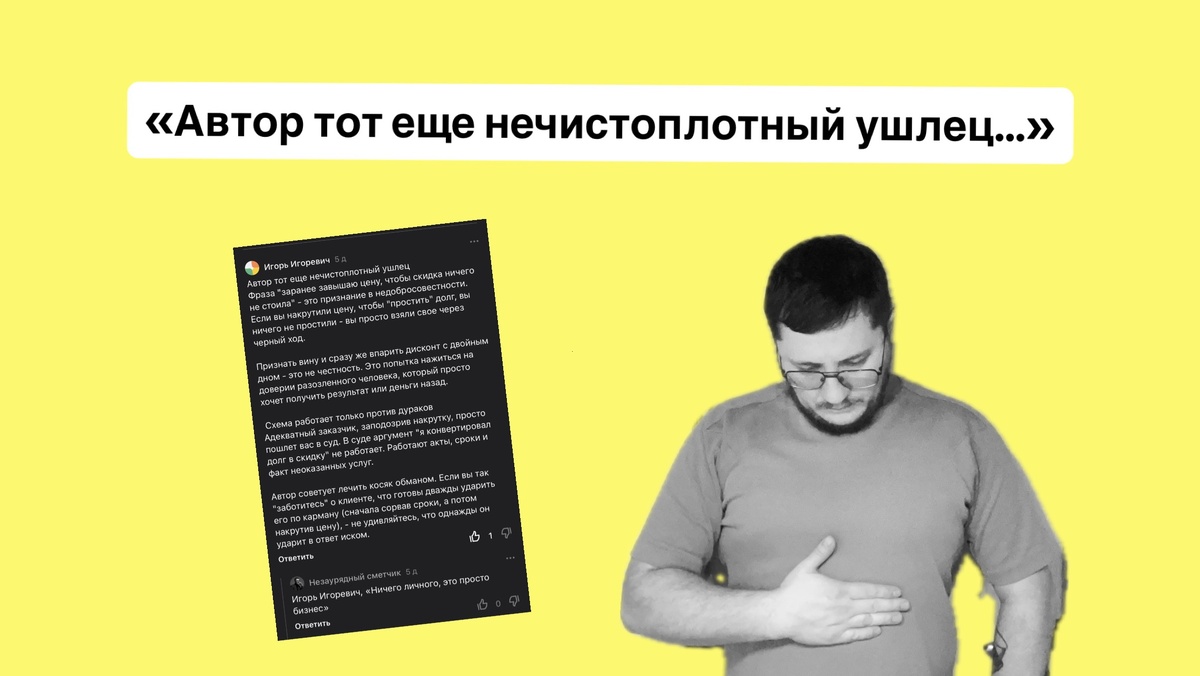 Я всегда стараюсь отвечать на критику, особенно если она конструктивная (или хотя бы даёт повод что-то прояснить). Тем более что этот комментарий касается важного момента — моего признания, что иногда я завышаю цену на следующие работы, чтобы скидка не так сильно била по карману. Мол, нечестно, непорядочно, «накрутка через чёрный ход».