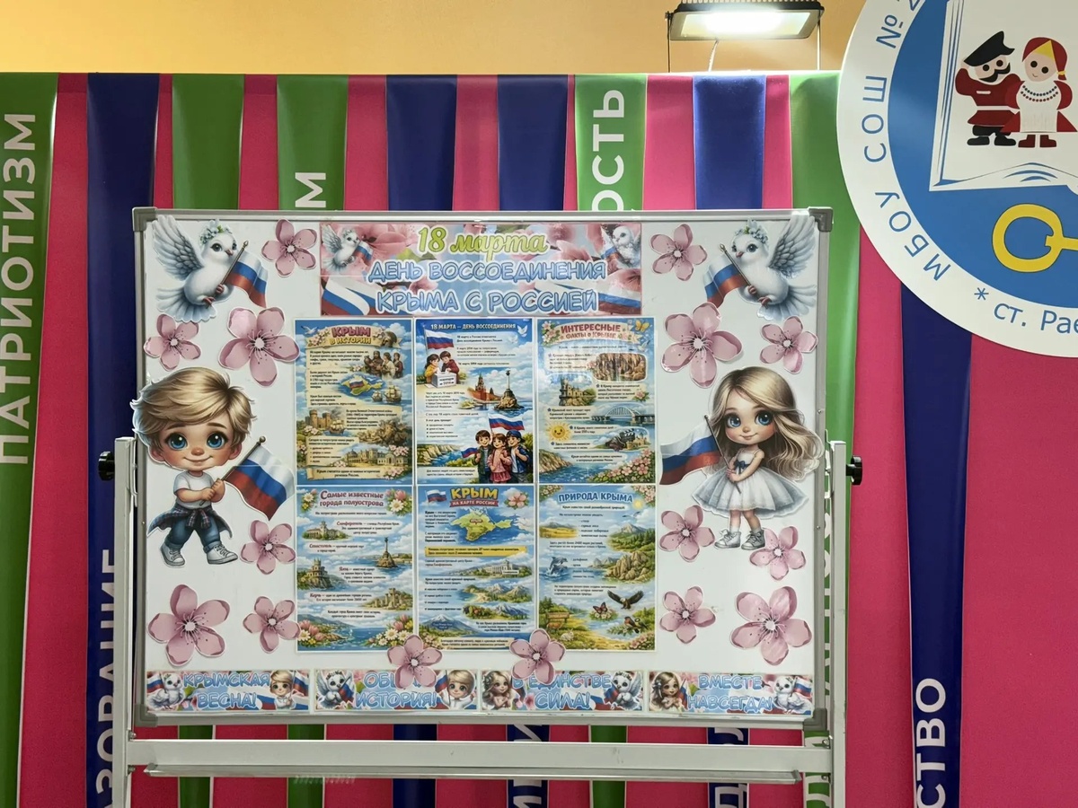 Н. Раевского создан информационный стенд о Дне воссоединения Крыма с Россией. Информация представлена в доступной форме специально для младших школьников. Стенд рассказывает о важности этого события, знакомит детей с историей и традициями празднования Дня воссоединения, помогая воспитывать чувство патриотизма и уважения к исторической памяти. #СОШ24_Новороссийск #КрымэтоРоссия #МедиаВолонтеры