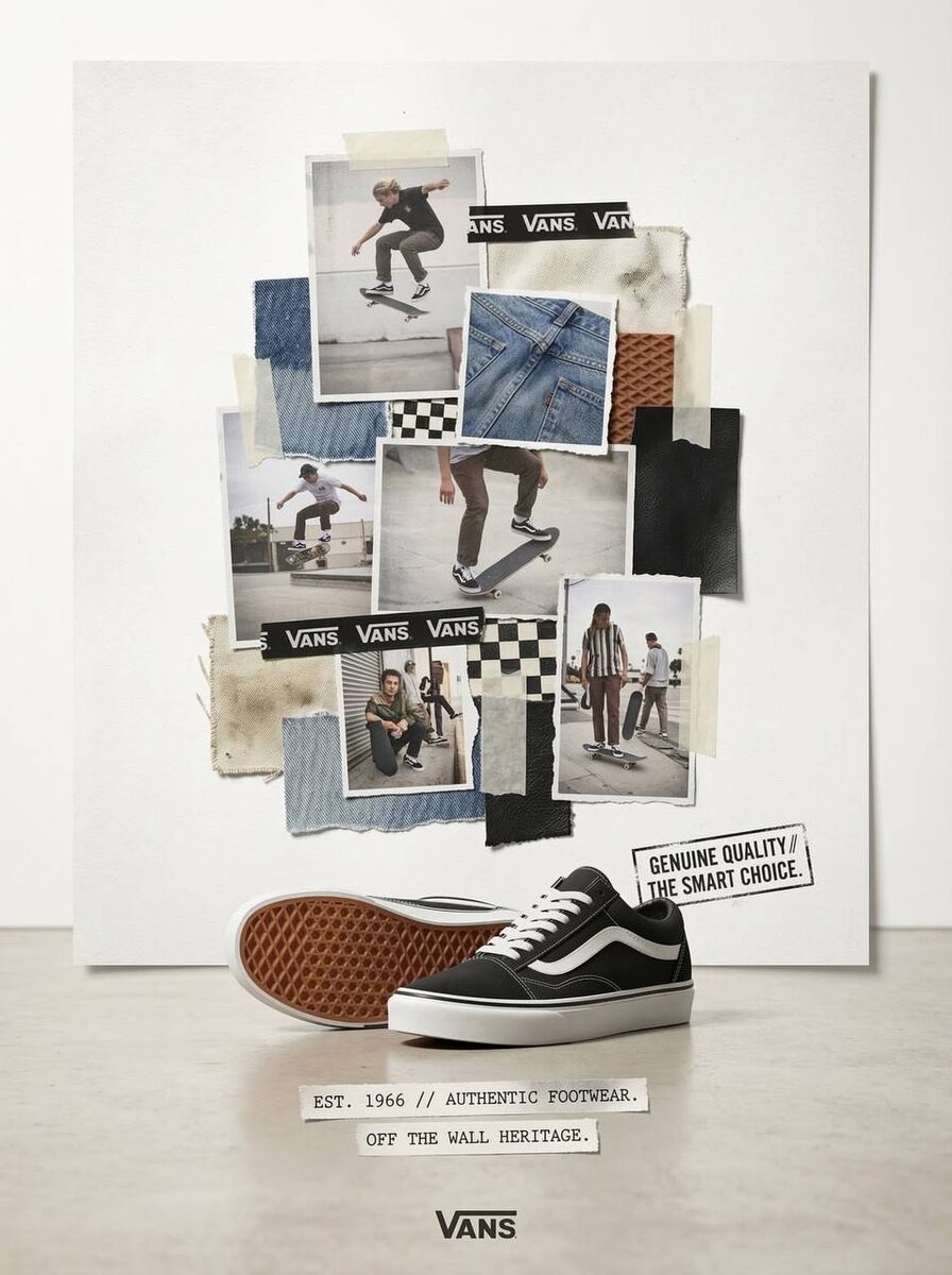 [Название бренда] [ТИП ПРОДУКТА] (Одежда / Продукты питания / Автомобили / техника). Цель: Создать профессиональный плакат-коллаж в стиле "скрапбукинга" для [Название бренда], сосредоточенный на [ТИПЕ ПРОДУКТА]. 1. ПРОДУКТ-ГЕРОЙ (НИЖНИЙ ФОКУС) - Объект: Реалистичный 3D-рендеринг [ТИПА ПРОДУКТА] в высоком разрешении по [Название бренда] в центре внизу. - Расположение: Слегка наклонено, чтобы показать глубину, с мягкими реалистичными тенями на гладком не совсем белом полу. 2. МНОГОСЛОЙНЫЙ КОЛЛАЖ. - Фотографии: Вертикальная стопка накладывающихся друг на друга фотографий с НЕРОВНЫМИ, оторванными краями из бумаги, возвышающаяся над продуктом. - Содержание: На фотографиях должны быть показаны [ТИП ПРОДУКТА] в процессе использования, снимки образа жизни, связанные с [Название бренда], и крупные планы конкретных деталей. - Материалы: физические образцы текстур, относящиеся к [ТИПУ ПРОДУКТА] (например, кожа/ткань для одежды, металл/карбон для автомобилей, органические ингредиенты для