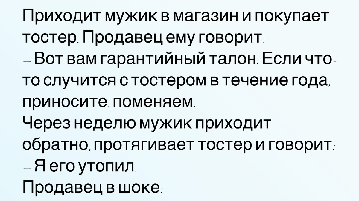 Вот это я понимаю, клиентоориентированность! Этот покупатель решил проверить гарантию на прочность самым… оригинальным способом. Видимо, он решил, что "если что-то случится" — это универсальная фраза, которая покрывает абсолютно все, включая собственные "эксперименты". Продавец, конечно, в ступоре, ведь такого в инструкции точно не было. Эта история — яркий пример того, как люди могут интерпретировать правила по-своему, доводя их до абсурда. А ведь иногда достаточно просто внимательно прочитать условия гарантии, чтобы избежать таких вот "мокрых" ситуаций.