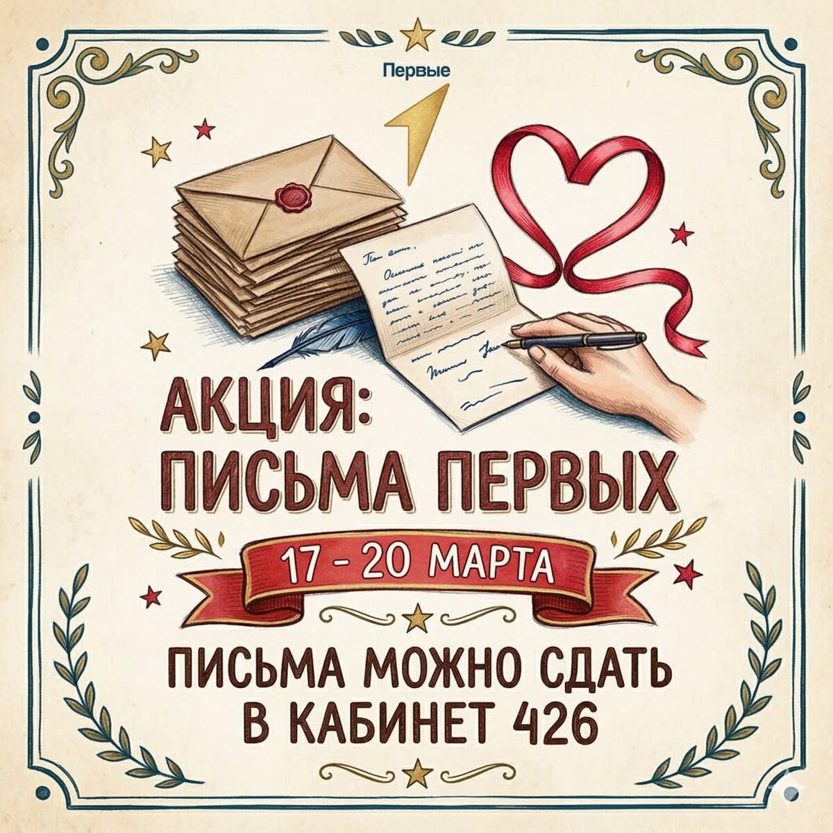 В XXI веке мы привыкли обмениваться сотнями сообщений в день, но как часто мы по-настоящему вдумываемся в каждое слово? Настало время замедлиться и вспомнить о том, что имеет особую ценность. Мы объявляем запуск акции «Письма Первых»! Это ваш шанс написать письмо школьному другу — по-настоящему, от руки. ✍️ Почему это важно? Ценность момента: Письмо, написанное на бумаге, — это редкость в цифровом мире. Его можно сохранить, перечитать спустя годы и почувствовать тепло рук отправителя. Глубина мыслей: Когда мы пишем вручную, а не печатаем на клавиатуре, мы больше вдумываемся в содержание. Каждая строчка становится осознанной, а каждое слово — весомым. Искренность: В бумажное письмо мы вкладываем частичку души, которую не передаст ни один смайлик. 📅 Когда: с 17 по 20 марта. 📍 Куда нести: готовые письма можно сдать в кабинет 426. Не упустите возможность удивить своего друга и подарить ему то, что сейчас ценится абсолютно иначе — ваше внимание и искренность, запечатленные на бумаге