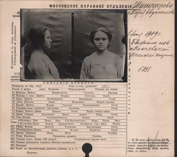Вихрь революционных событий, пронесшийся над Россией в 1905-07 годах, закружив, запутав, потащив за собой, самым роковым образом повлиял на судьбы множества совсем молодых людей. Одной из таких «подхваченных вихрем времени» была Мария Евдокимовна Шишкарева. Она родилась 14 января 1889-м года, в селе Непецино, Коломенского уезда. Как и когда она примкнула к революционному движению, в точности неизвестно. О внешности Марии можно судить по заметкам её карточки из картотеки московского Охранного Отделения: « рост 2 аршина 4 вершка (164 см), телосложения среднего, глаза желто-серые, волосы черные, лицо русского типа, бледно-белое». В 1907-м году московское Охранное Отделение арестовала боевую группу, к которой принадлежал Шишкарева, и её судили вместе с товарищами. За участие в вооруженных грабежах, которые революционеры называли «экспроприациями» московский военно-окружной суд 15 октября 1907 года приговорил Марию Шишкареву к 20 годам каторжных работ.