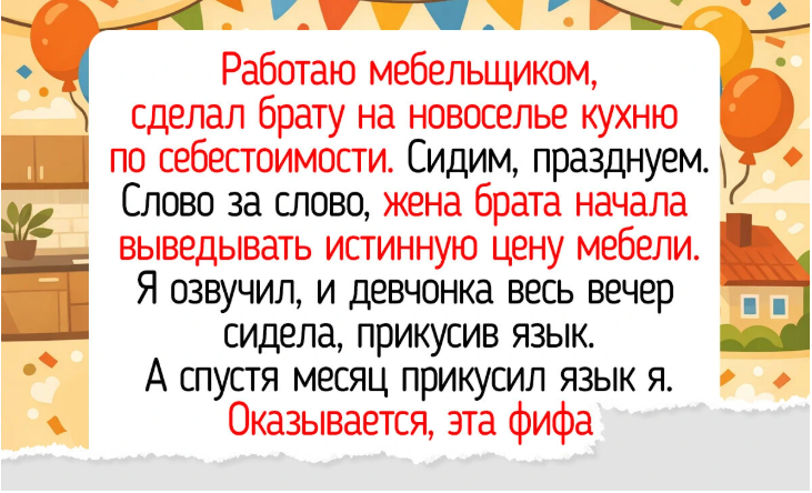 - Работаю мебельщиком, сделал брату на новоселье кухню по себестоимости. Сидим, празднуем. Слово за слово, жена брата начала выведывать истинную цену мебели. Я озвучил, и девчонка весь вечер сидела, прикусив язык. А спустя месяц прикусил язык я. Оказывается, эта фифа разрекламировала меня всем и вся, создала сайт с моими данными и всячески толкала мои услуги. И на меня просто повалились заказы.
