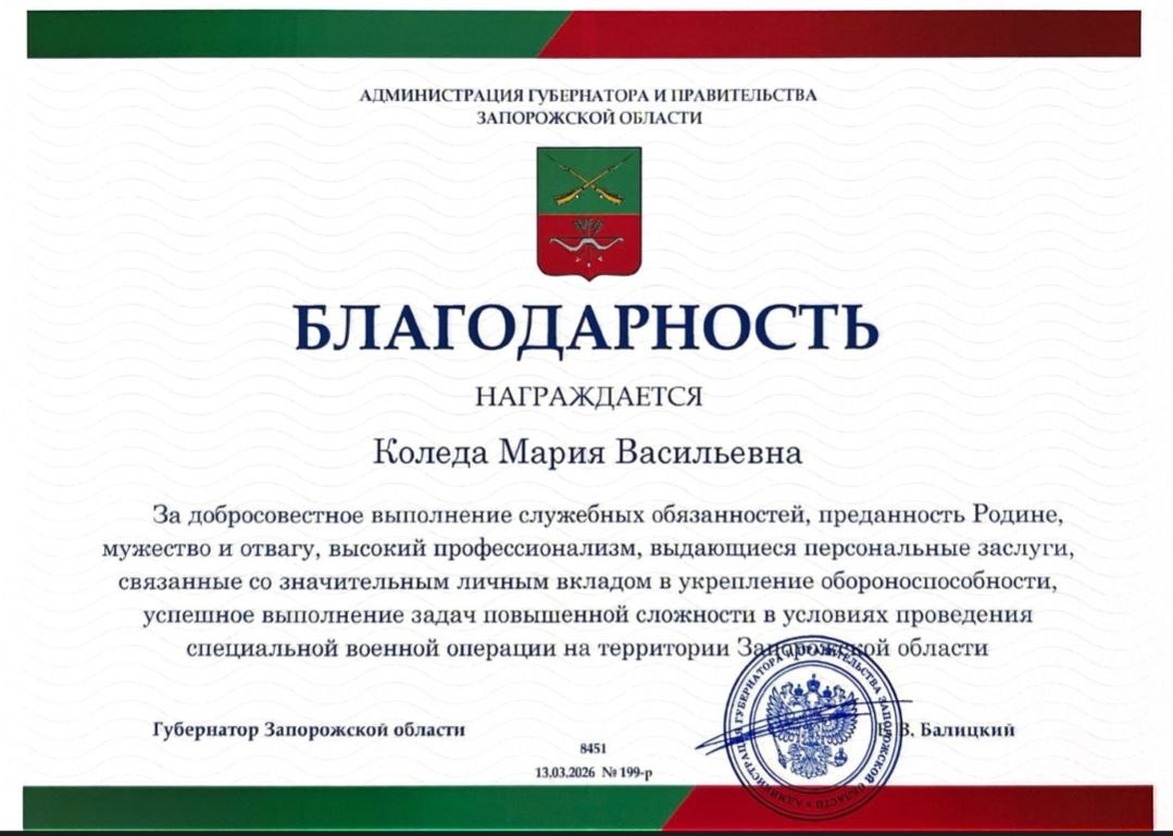 🏆Получила Благодарность от Губернатора Запорожской области — за службу, мужество и личный вклад в укрепление обороноспособности
