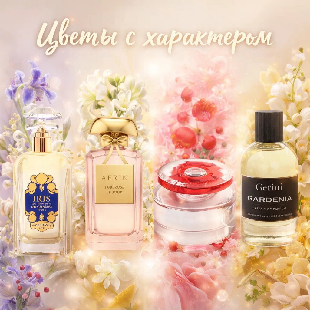 🌸 Хорошая цветочная подборка всегда строится не на количестве цветов, а на различиях между ними. Ирис умеет делать композицию суше и тоньше. Тубероза приносит белое свечение и объём. Роза, магнолия и гардения могут либо собраться в плотный аккорд, либо разойтись по пространству так, что между ними останется воздух. Один и тот же жанр в итоге даёт совершенно разное настроение, разное звучание на коже, разный ритм.