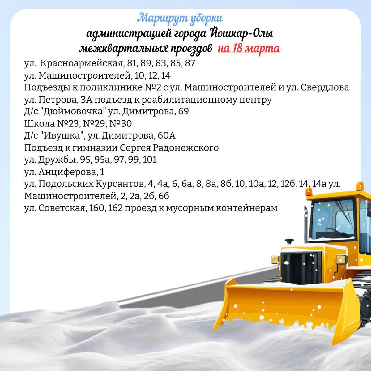 Мэрия Йошкар-Олы опубликовала планируемый маршрут движения снегоуборочной техники по расчистке межквартальных проездов на 17 марта.