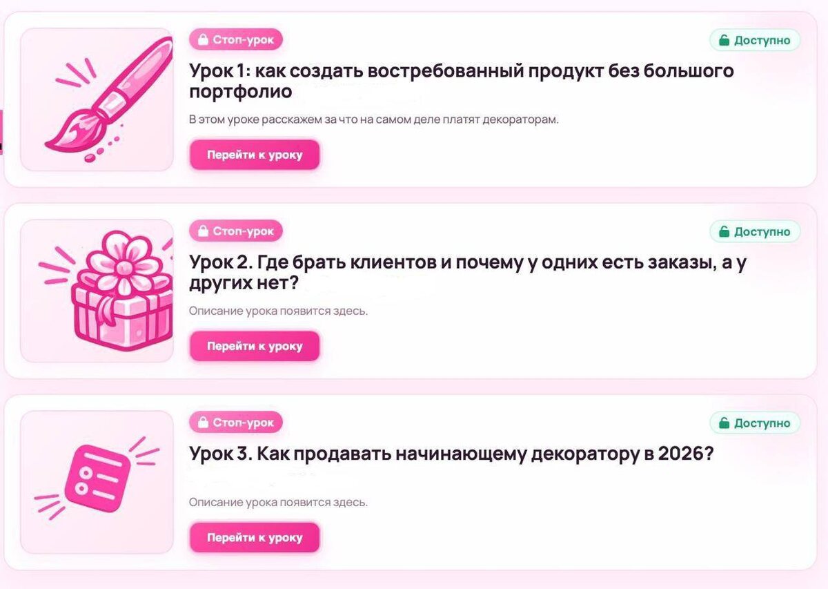 Если вы до сих пор: 👉 Листаете Pinterest, но не решаетесь повторить понравившееся для реальных клиентов, 👉 Оформляете праздники подругам «за спасибо», 👉 Слышите «как красиво!», а потом — «ну ты же для души, денег не надо», 👉 Боитесь назвать цену выше 25–40 тысяч, 👉 Не понимаете, как другие декораторы выходят на оборот в 150+ тысяч и берут заказы за 50, 80 и выше, 👉 И тихо злитесь, что ваше хобби так и не стало доходным делом... Тогда эти 3 дня — ваш шанс все изменить. Этот бесплатный мини-курс создан именно для вас. На 3 мощных уроках вы узнаете: 1️⃣ Что на самом деле продает декоратор (а не просто «красивенько»), и за что клиенты платят большие деньги. 2️⃣ Где брать первые заказы — даже если у вас нет портфолио и бюджета на рекламу. 3️⃣ Как общаться с клиентом, чтобы он сам просил вас об оформлении и легко соглашался на вашу цену. Что вы получите сразу после регистрации: ✅ Доступ к 3 видео-урокам — смотрите в удобном темпе. ✅ Именной сертификат — можно сразу показывать клиент