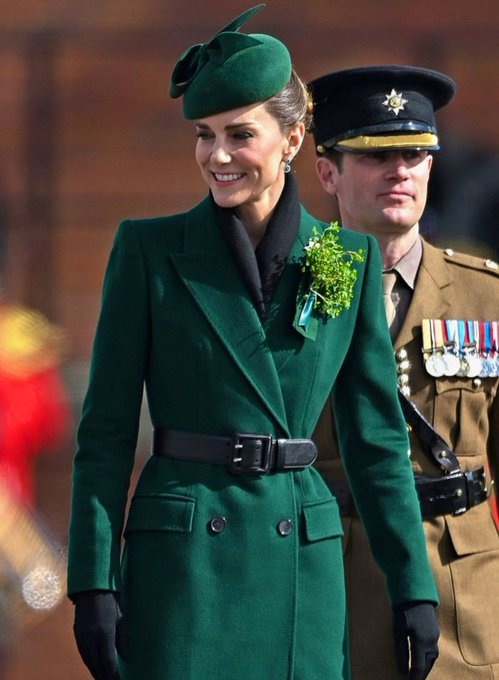 Кейт, принцесса Уэльская, приняла участие в одном из самых ожидаемых событий года. В качестве полковника Ирландской гвардии принцесса Кэтрин прибыла в казармы Мон в Олдершоте, чтобы принять участие в ежегодном параде в честь Дня святого Патрика. Кэтрин присоединилась к параду и вручила традиционные веточки трилистника офицерам и гвардейцам, которые, в свою очередь, раздали их солдатам. Ещё одним трогательным моментом стало вручение принцессой веточки трилистника талисману ирландского волкодава по кличке Шеймус. На общем фото: Официальная часть церемонии завершилась королевским салютом и торжественным маршем, во время которого будущая королева приняла салют в качестве полковника полка с трибуны.