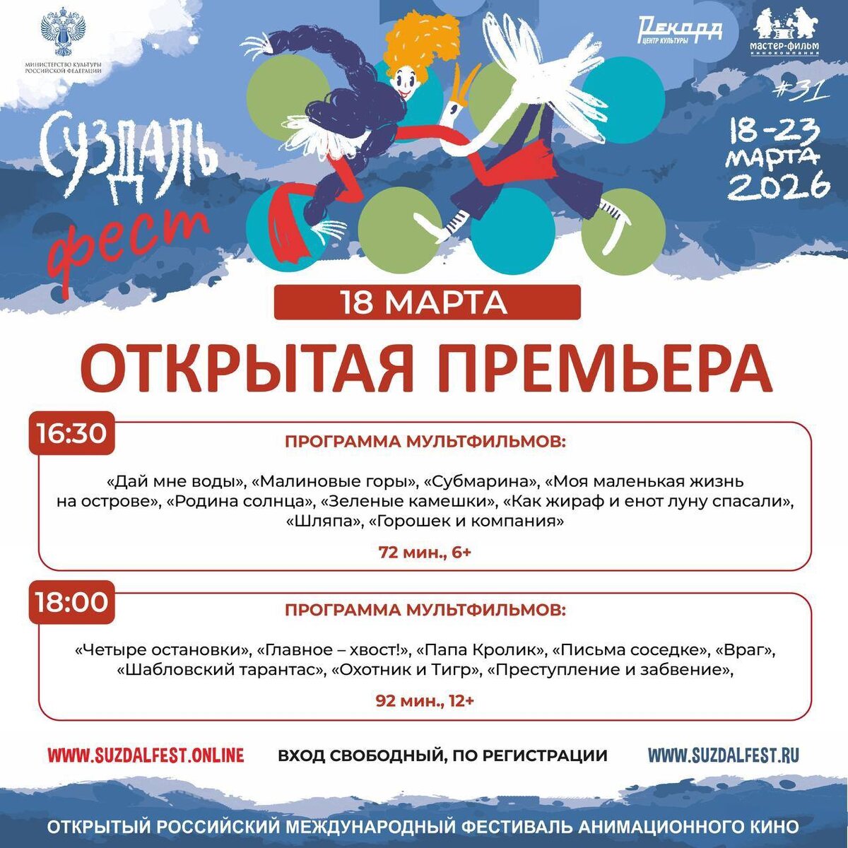 + 🎬🧡 🗓 18 марта в 16:30 мультфильмы 6+ — регистрация по ссылке ⏰ В 18:00 мультфильмы 12+ — регистрация по ссылке 📍 Центр культуры «Рекорд» «Открытая премьера» — некоммерческий показ самых свежих анимационных работ, который проходит одновременно с XXXI фестивалем анимационного кино «Суздальфест» (18–22 марта, Суздаль). Если давно хотелось выбраться на что-то нестандартное — отличный повод 👀✨ 👉 Подписаться на нас в MAX 📲 .