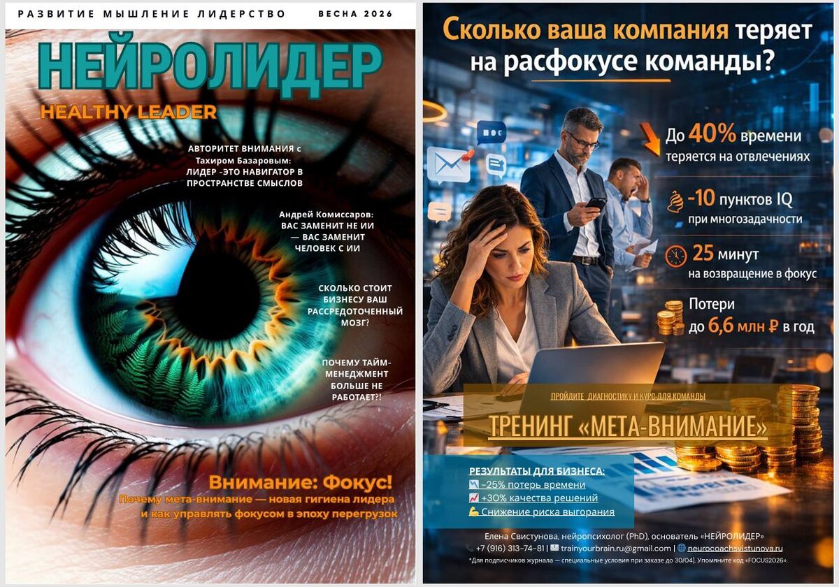 Мы собирали его 3 месяца. Интервью с легендами. Исследования. Инструменты. Тесты. Всё, чтобы вы наконец перестали винить себя за расфокус и начали управлять вниманием как активом. Что внутри: • Тахир Базаров: «Лидер — это навигатор в пространстве смыслов» • Андрей Комиссаров: «Вас заменит не ИИ — вас заменит человек с ИИ» • Карта компетенций мета-внимания — забирайте в HR • Тест: абстинент, слоупер или кентавр? (спойлер: кентавры рулят) • Регата как HR-инструмент — кейс от ПроВода Владимир Павлин • Языковой фитнес от DS School • И 60+ страниц нейронауки, практик и вдохновения Как читать: 🖥 На компе: откройте PDF, в настройках выберите «Показать титульную страницу отдельно» — и листайте развороты. 📱 На планшете: скачайте и смотрите через книжный редактор. 👆 Оглавление кликабельно — жмите и переходите к нужному. 📍 Скачать бесплатно: [ССЫЛКА] Перешлите тому, кому сейчас не хватает фокуса 👇 #НЕЙРОЛИДЕР #ВНИМАНИЕ #лидерство #карьера #HR #журнал #HEALTHYLEADER