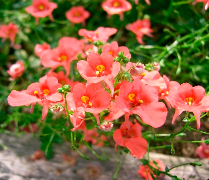 Diascia 'Coral': Сорта с яркими коралловыми и лососевыми цветами, которые мгновенно привлекают внимание и добавляют саду солнечного настроения.