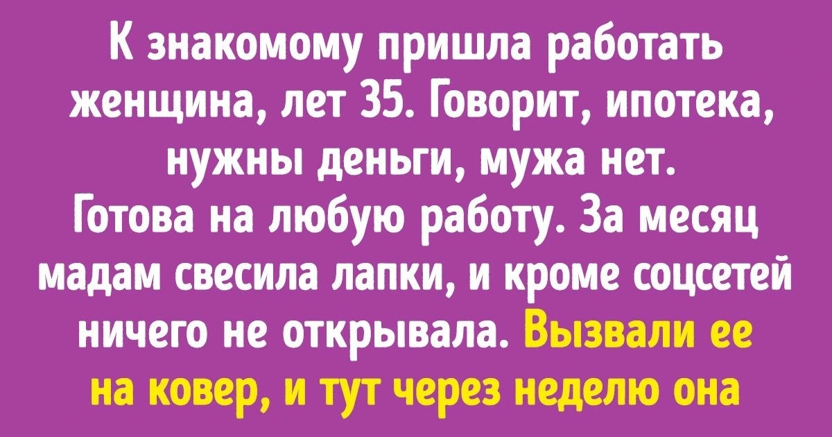 Слово «коллега» имеет латинское происхождение и означает «совместно избранный». Но иногда встречаются такие кадры, что никак не можешь взять в толк, как их выбирали, почему они собеседование прошли. С другой стороны, без них работа не была бы такой интересной, а в сети не было бы классных историй про сослуживцев. Мы в ADME своих коллег обожаем, черпаем от них вдохновение и заряжаемся креативом, но не всем так повезло. Вот мы и решили узнать истории тех людей, для которых работа с коллегами - это ежедневное испытание на прочность. К знакомому пришла логистом женщина лет 35. Говорит, вдова, тяну ипотеку, нужны деньги, готова выполнять любую работу. Взяли. За месяц мадам свесила лапки, и, кроме соцсетей, ничего не открывала и работать не пыталась. Вызвали ее на ковер. Так и сяк. Надо работать, если ты тут остаться хочешь. А через неделю она приносит справку: «Я беременна, работать за компом не могу». Далее мадам демонстративно сидела за компом, не делая ничего. Ведет себя вызывающе, на пр