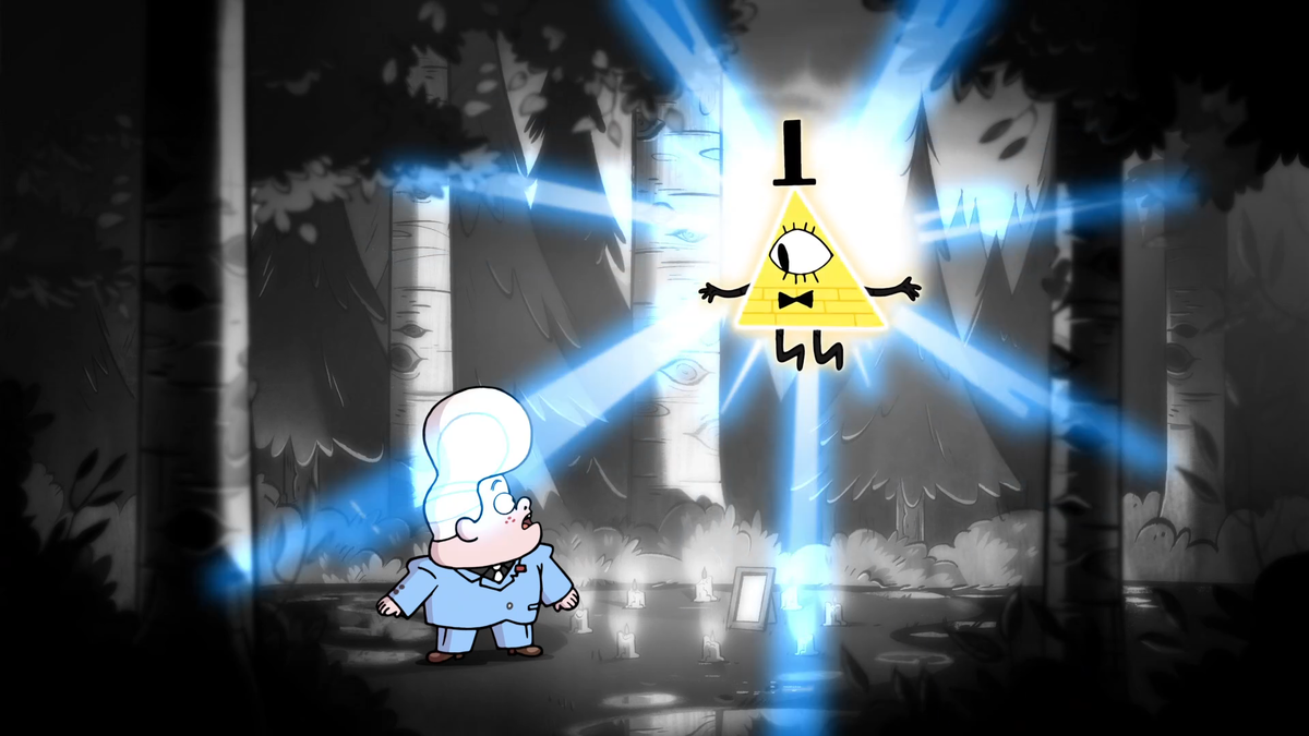 Билл называет героев по их символам. Зус - знак вопроса, Мейбл - звездочка, а Диппер - сосна ( в русском дубляже - ёлка).