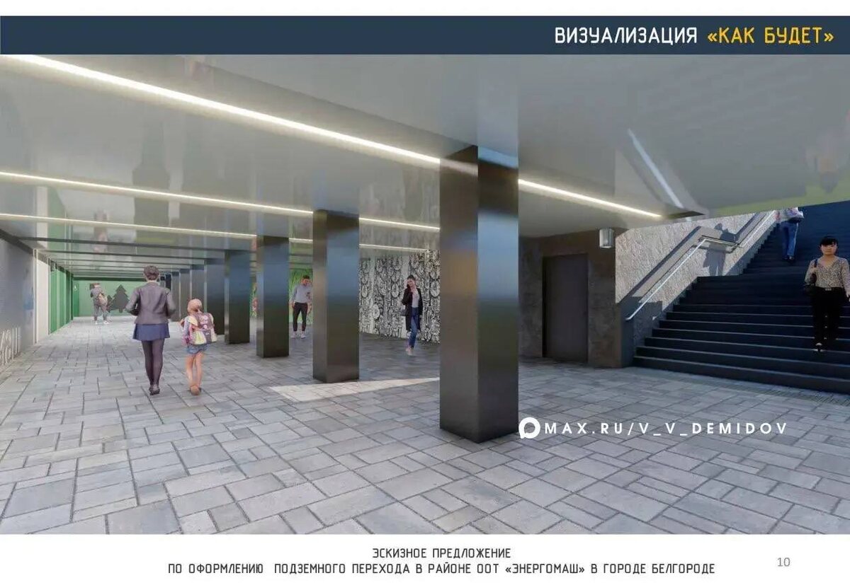 Как рассказал мэр Белгорода Валентин Демидов, проектная документация прошла госэкспертизу, на этой неделе проведут необходимые процедуры и определят исполнителя. В первую очередь работы начнутся в переходе «Энергомаш». Для внутренней отделки будет использоваться металлический композит. Опыт его применения в городе уже показал свою эффективность – им отделан подземный переход через пр. Б. Хмельницкого от НИУ БелГУ в парк Победы. В переходе «Энергомаш» не планируются места для торговли. Все помещения, которые сейчас закрыты металлическими жалюзи, будут демонтированы. За счёт этого расширится пространство, пользоваться переходом будет комфортнее. Проектом предусмотрен сход для маломобильных граждан. Валентин Демидов отметил, что идея внутренней отделки подсказана местоположением перехода – с одной стороны находится Центральный парк культуры и отдыха им. Ленина, с другой – завод «Энергомаш». Архитекторы объединили природную и индустриальную тематики во внутренней отделке и в конструктив