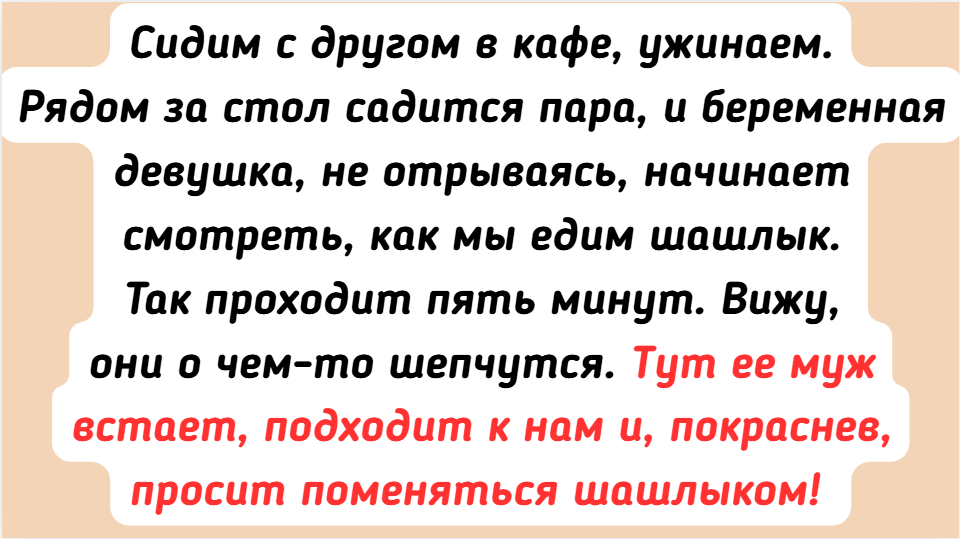 - Сидим с другом в кафе, ужинаем. Рядом за стол садится пара, и беременная девушка, не отрываясь, начинает смотреть, как мы едим шашлык. Так проходит пять минут. Вижу, они о чем-то шепчутся. Тут ее муж встает, подходит к нам и, покраснев, просит поменяться шашлыком! Потому что его беременной жене показалось, что у нас вкуснее. Мы, конечно, согласились. Но вообще это так мило — встал, не постеснялся. Респект, бро! © yerali_atibekov