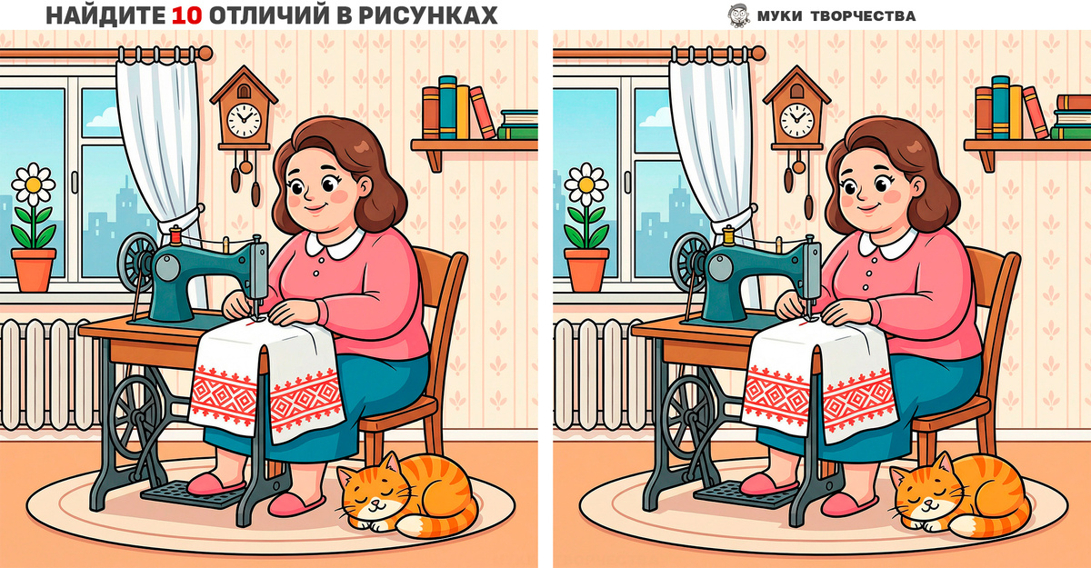 Друзья, давайте немного отдохнём и проведём время с пользой. Поиск отличий на картинках хорошо тренирует мозг на концентрацию внимания и память. Это очень важные функции нашего мозга для полноценной жизни. Сегодня тематика картинок особенно понравится любителям рукоделия и вышивки. На двух похожих рисунках, где милая женщина приятно проводит время за шитьём, есть 10-ть отличий. Которые вам и предстоит найти. Отложите свои дела на пару минут и внимательно рассмотрите картинки. Отличия могут быть в форме и цвете предметов, в добавленных или стёртых элементах. Для проверки ваших предположений в конце статьи будет подсказка-ответ. Поделитесь этой задачкой на наблюдательность с тем, кому она может понравиться. Горизонтальная версия: Тёплый вечер за шитьём Вертикальная версия: Тёплый вечер за шитьём Вам может быть это интересно: ОТВЕТ-ПОДСКАЗКА: