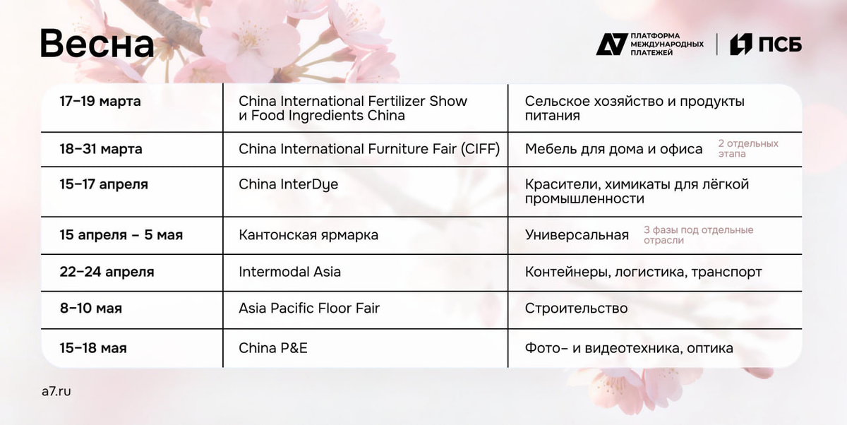 Сохраните расписание, чтобы ничего не упустить! Ставьте 👍 , и мы подготовим аналогичные календари на лето и осень Перед посещением мероприятия стоит заранее продумать, как будете проводить расчёты с будущими партнёрами. Платформа А7 переводит деньги в Китай за 4 часа (а рекорд — 100 минут).
