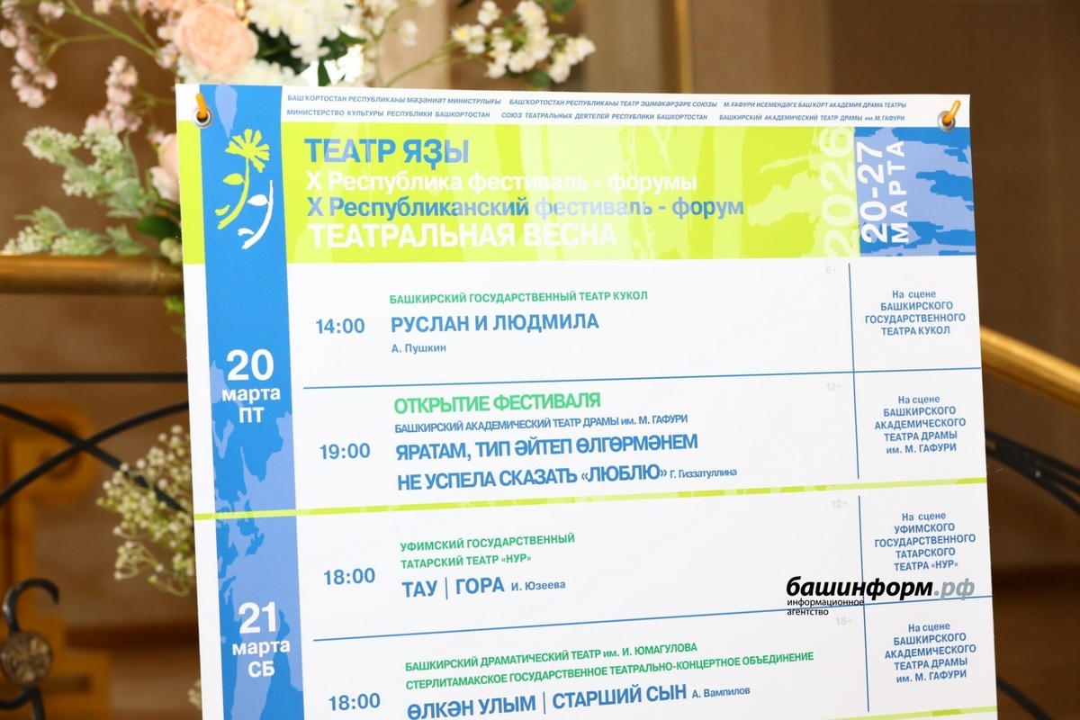 В столице республики с 20 марта стартует Х республиканский фестиваль-форум «Театральная весна». После девятилетнего перерыва в Башкирию возвращается один из самых значимых культурных форумов — республиканский фестиваль «Театральная весна». Сегодня в Башкирском академическом театре драмы имени М. Гафури организаторы и идеологи проекта рассказали, чем удивит обновленный формат конкурса. Директор Башдрамтеатра Зиннур Сулейманов отметил, что за время отсутствия фестиваля театральная среда успела соскучиться по профессиональному диалогу такого масштаба. «Девять лет — это большой срок. Фестиваль проводится силами министерства культуры РБ, Союза театральных деятелей республики и наших театров. Мы очень рады, что „Театральная весна“ вновь объединит все профессиональные коллективы республики в Уфе», — добавил он. По его словам, в этом году программа обещает быть максимально насыщенной. Официальный старт «Театральной весне» дадут 20 марта на сцене Башкирского государственного театра кукол - зрит