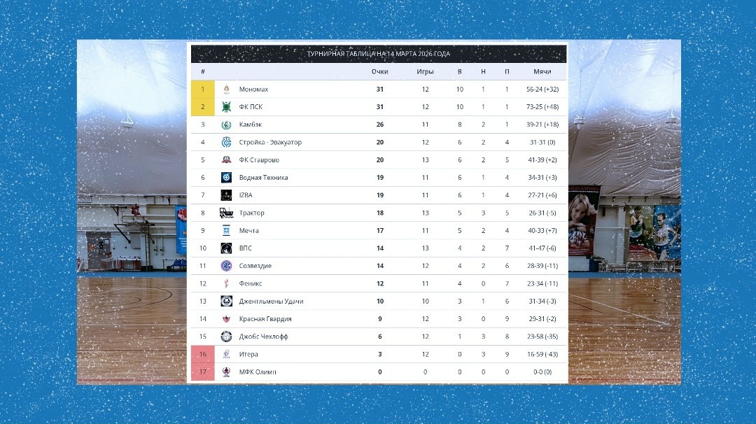 3-я лига. Зона А 📅 Турнирная таблица на 14 марта 2026 года ФК ПСК уверенно обыграл Камбэк и сравнялся с Мономахом по очкам. У Камбэк первое поражение в сезоне и даже победа в пропущенном матче не позволит догнать лидеров, отставание в 5 очков. 🎯 Больше всех на сегодня забили игроки ФК ПСК – 73 мяча в 12 играх, у них же лучшая разница (+48). Меньше всех пропустил Камбэк – 21 мяч в 11 играх. Самые меткие на сегодня Руслан Альмяшев (МОН) и Дмитрий Жарков (ВПС) – у обоих по 20 голов в 9 играх. https://befutsal.ru/league.php?l=224668565