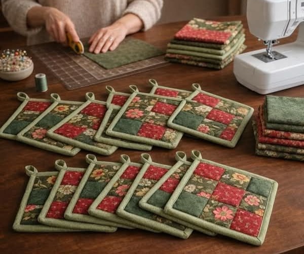 На фото вы видите прекрасный пример лоскутных прихваток: геометрические узоры, сочетание тёплых и холодных оттенков, аккуратная окантовка. Каждая прихватка — как маленькое произведение искусства, в котором воплотилась фантазия мастерицы. 👇