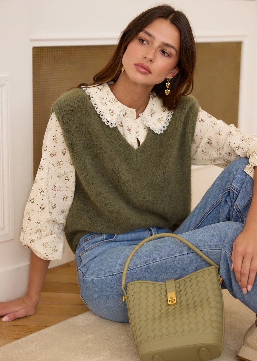 Совет от стилиста: играйте с фактурами! Вязаный жилет отлично сочетается с кожей, атласом, кружевом и денимом. Добавьте аксессуары — шляпу, сумку‑тоут или массивное колье — и образ заиграет новыми красками.