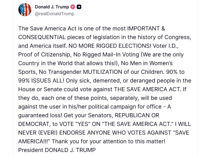 'Only sick, demented, or deranged people in the House or Senate could vote against THE SAVE AMERICA ACT' — Trump