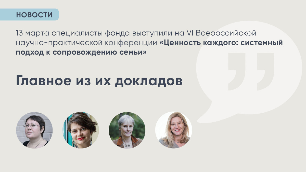 13 марта специалисты фонда выступили на VI Всероссийской научно-практической конференции «Ценность каждого: системный подход к сопровождению семьи». Модерировали сессию «Трудности перехода — из детского дома в семью» Елена Альшанская, руководитель фонда «Волонтёры в помощь детям-сиротам» и Айгуль Гареева, президент благотворительного образовательного фонда «Мархамат».