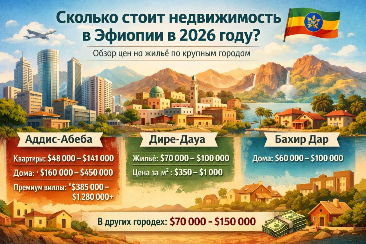 Эфиопия остается одним их самых динамичных рынков недвижимости в восточной Африке. Telegram-канал МИЧ собрал актуальные цены на жилье в крупнейших городах страны. Аддис‑Абеба — столица и самый дорогой рынок страны. Однокомнатные квартиры и студии здесь стоят от $48 000, 2-3‑комнатные - от $83 000, Дома среднего уровня - от $160 000, а премиальные виллы – от $385 000. Самые дорогие локации в столице - районы Боле и Казанчис, самые дешевые - Лебу и Айят. Город Дире‑Дауа: квартиры от $70 000, дома - от $100 000. Бахир Дар: квартиры от $60 000, дома - от $100 000. Меккеле: квартиры от $70 000, дома - от $150 000. В 2025 году цены на жильё в Эфиопии увеличились примерно на 9% в провинции и на 15% в столице. Но этот рост зафиксирован в национальной валюте. С учетом инфляции цены в Аддис-Абебе выросли на 3%, а в остальной части страны практически не подорожали.