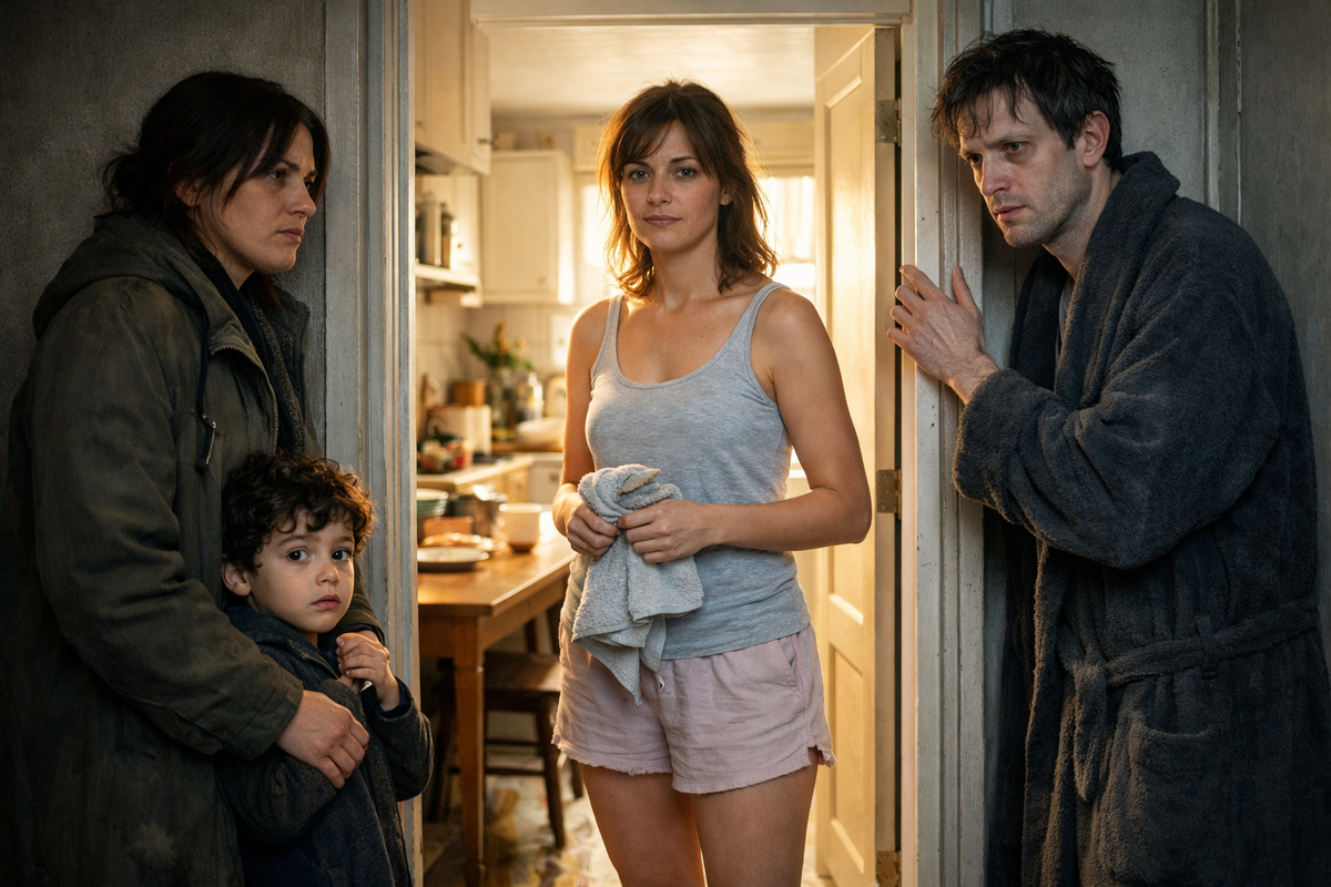 Из спальни вышел Евгений, в халате, сонный. Увидел Ирину с мальчиком — и застыл.