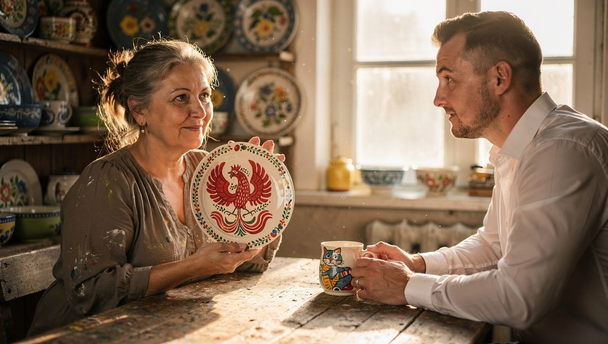 В день ярмарки Нина Васильевна расставила свои изделия на длинном столе, застеленном льняной скатертью. Маленькие керамические домики с крошечными окошками, расписные тарелки с жар-птицами и полевыми цветами, кружки с весёлыми котами, подсвечники в форме старинных фонарей. Всё это переливалось красками и притягивало взгляд, как витрина волшебной лавки.