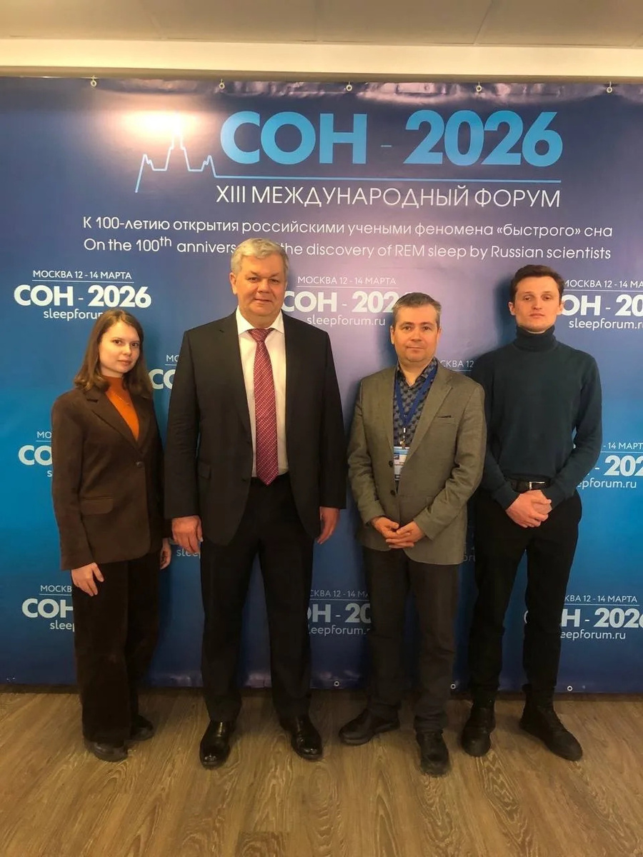 Команда ученых НТЦ биомедицинской фотоники ОГУ имени И.С. Тургенева в составе ведущего научного сотрудника Дунаева Андрея Валерьевича и стажёров-исследователей Локтионовой Юлии и Янушина Вячеслава посетила XIII Международный форум «СОН-2026», который проходил с 12 по 14 марта, и был посвящен 100-летию открытия фазы быстрого сна. Проведение форума приурочено ко Всемирному дню сна, а местом его проведения стал Медицинский научно-образовательный институт МГУ им. М.В. Ломоносова. Основные цели проведения форума: Программа Международного форума «Сон-2026» охватывала доклады, мастер-классы, круглые столы и клинические обсуждения. На протяжении трёх дней участники форума обсуждали развитие сомнологии и медицины сна в России, а также современные вызовы и перспективы внедрения новых технологий. Особое внимание уделялось рассмотрению возможности увеличения прибыли государственных и частных структур здравоохранения с внедрением новых технологий медицины сна. Ведущий научный сотрудник Научно-тех
