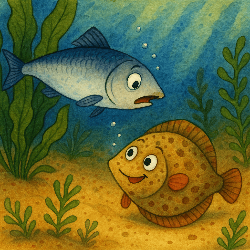 Тут песок на морском дне пришел в движение и со дна поднялась небольшая плоская рыба, у которой оба глаза смотрели наверх. Всё тело этой удивительной рыбы было пятнистым и немного присыпанным песочком, так что совершенно сливалось с морским дном.