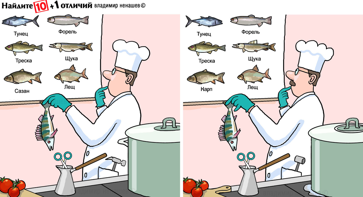 Тест на внимание "10 отличий". Загадка про повара и непонятную рыбу.