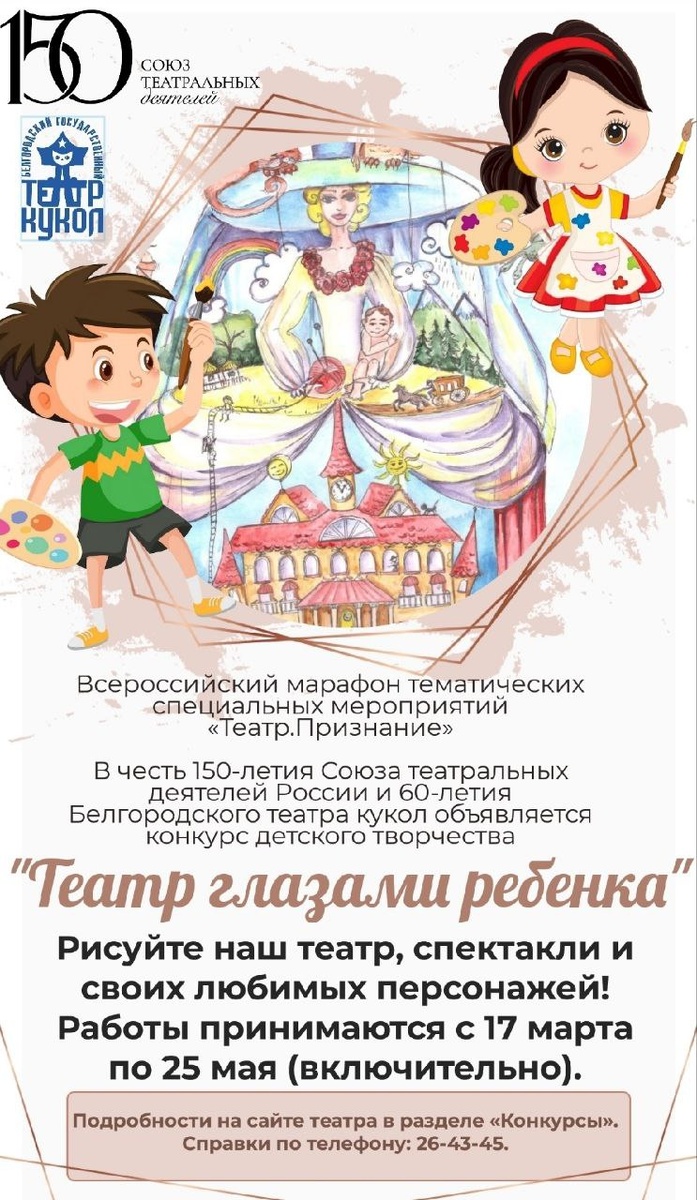 ! В честь 150-летия Союза театральных деятелей России и 60-летия Белгородского театра кукол стартует конкурс детского творчества «Театр глазами ребёнка»! 👨👩👦👦 Рисуйте наш театр, спектакли и своих любимых персонажей! Условия участия в Положении на сайте театра в разделе «Конкурсы» https://bgtk.org/contests/#content