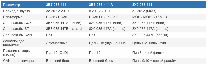 РАЗЪЁМ - 1. 3B7 035 444 РАЗЪЁМ - 2. 3B7 035 444 A РАЗЪЁМ - 3. 8X0 035 444 Первое поколение Quadlock. Устанавливался на автомобили платформ PQ25 и PQ35 до конца 2010 года. Содержит основной блок питания и аудио, к которому вставляются два дополнительных разъёма — синий и салатовый. Разъёмы 3B7 035 447A/B двухчастные — внешняя цветная оболочка + внутренний блок. Некоторые снимали оболочку и вставляли только внутреннюю часть — контакт будет ненадёжным. Всегда использовать в