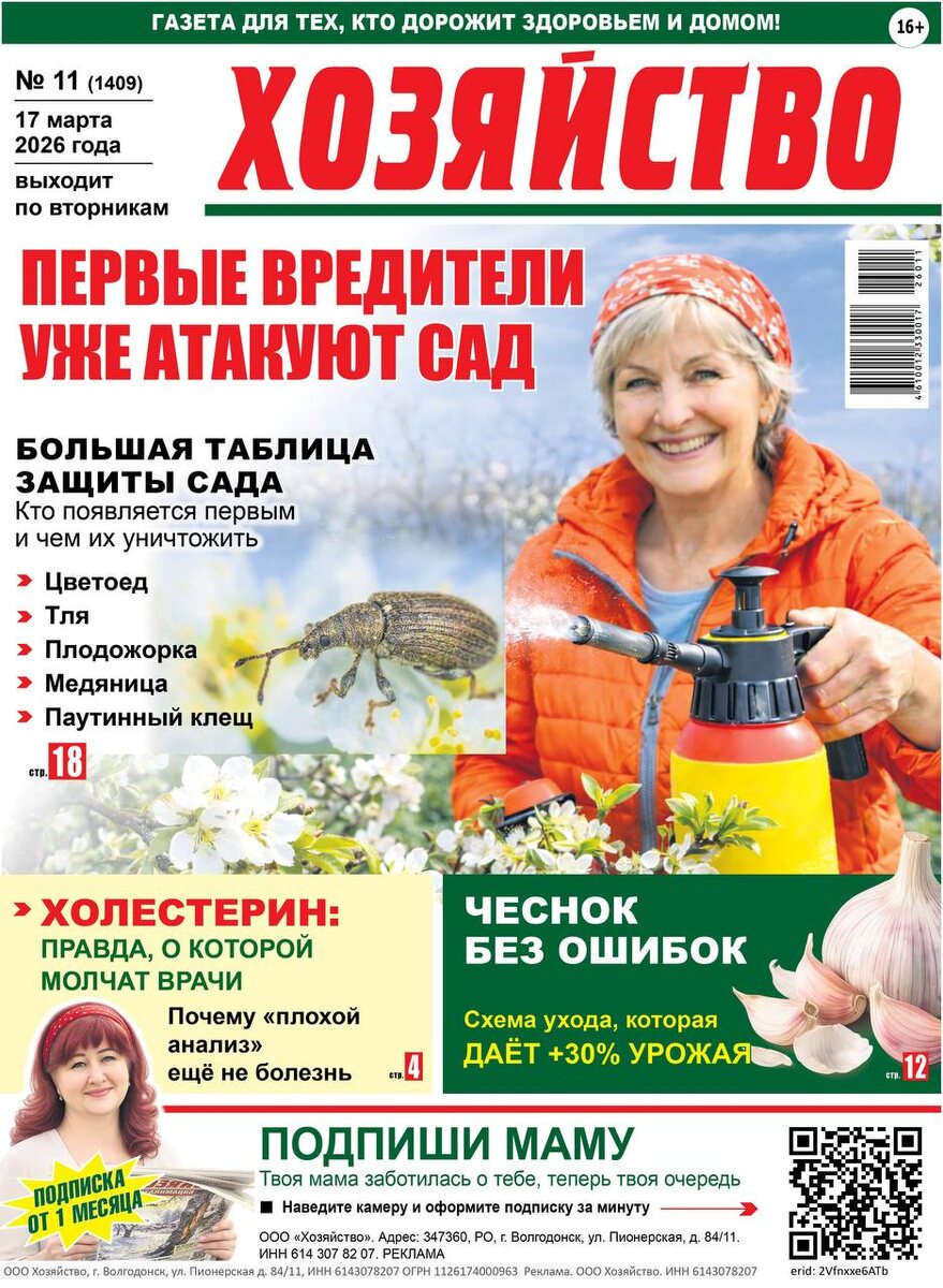 Это происходит прямо сейчас. Пока кажется, что всё спокойно, вредители уже уничтожают будущий урожай. Яблонный цветоед выедает бутоны изнутри – и урожай можно потерять ещё до цветения. Дальше – хуже: тля, клещи, плодожорка. Большинство дачников теряют урожай не потому что не стараются, а потому что не знают, когда действовать. Хотите, чтобы мама не допустила этой ошибки? Подпишите её на «Хозяйство» (16+) – там всё расписано по дням: что делать, чем обрабатывать и как сохранить урожай без лишней химии. Оформить подписку можно за минуту: выберите срок и адрес, оплатите – Почта России доставит газету прямо в ящик. Подписка от 1 месяца 👉 clck.ru/3PFaPB