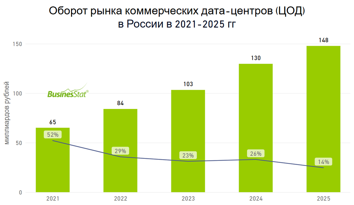 По данным "Анализа рынка коммерческих дата-центров в России", подготовленного BusinesStat в 2026 г, в 2021-2025 гг оборот рынка ЦОД в стране увеличился в 2,3 раза: с 65 до 148 млрд рублей. Главным драйвером выступил устойчивый дефицит вычислительных мощностей: спрос на услуги дата-центров стабильно опережает предложение. Цифровизация бизнеса и государственного сектора, требования законодательства о локализации персональных данных и экспансия облачных платформ формировали базовый уровень спроса. Рост популярности искусственного интеллекта и машинного обучения, требующих значительных вычислительных ресурсов, стал дополнительным импульсом с 2023 г, когда AI-нагрузки заняли заметную долю в запросах операторов на стойко-места. Расширение клиентской базы за счет малого и среднего бизнеса, получившего доступ к инфраструктуре через облачные платформы, обеспечивает устойчивый прирост числа потребителей. В 2025 г прирост оборота рынка коммерческих дата-центров в России замедлился до 14%. Снижени