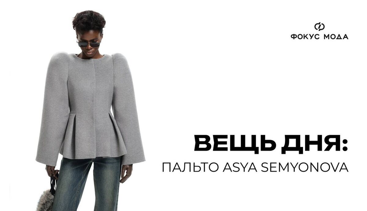 Модель выполнена из мягкой пальтовой ткани с содержанием шерсти, продублированной для сохранения формы, поэтому силуэт держится чётко и почти скульптурно. Приталенный крой с длиной чуть ниже бедра дополнен складками от линии талии, которые формируют выраженную баску и усиливают ощущение выстроенной, почти кутюрной конструкции. Несмотря на выразительный крой, пальто остаётся универсальным. Оно одинаково органично смотрится с костюмами и платьями, но особенно интересно работает на контрасте с денимом — как в лукбуке, где расклешённые джинсы делают силуэт менее строгим и подчёркивают, что архитектурный крой сегодня вполне может существовать внутри повседневного гардероба. #ФокусМода_ВещьДня ⚫️ focusmoda.ru