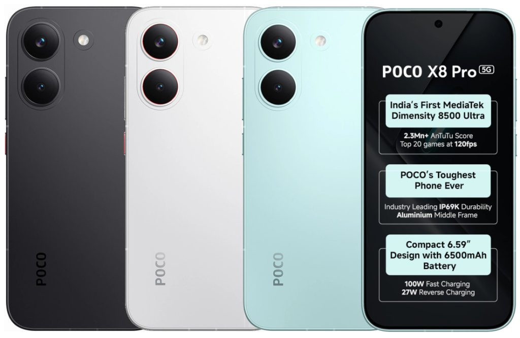 В Poco представили новые смартфоны — X8 Pro и X8 Pro Max. Устройства, как водится у бренда, получили довольно мощное «железо» и приемлемые для этого класса аппаратов цены. Ниже — подробнее. X8 Pro У девайса — плоский экран на 6,59 дюйма (1,5K, AMOLED, 120 Гц), говорят про пиковую яркостью в 3500 нит. Телефон основывается на чипе Dimensity 8500-Ultra (4-нм техпроцесс) от MediaTek и оснащается 8/12 ГБ оперативной памяти — в AnTuTu, как утверждают в компании, такая связка выдает более 2 миллионов баллов. Систему охлаждения также усилили. ОС — Android 16, поверх — оболочка HyperOS 3. Заявляется также и про 4 года обновлений ОС, и про 6 лет патчей системы безопасности. Батарейка — на 6500 мАч, с поддержкой 100-ваттной проводной зарядки (0—100% за 48 минут). У X8 Pro металлический каркас, сзади — стеклянная панель. Телефон защищен по стандартам IP66/IP68/IP69/IP69K. Основная камера у устройства на 50 Мп (f/1.59), есть также «ширик» на 8 Мп и селфи-датчик на 20 Мп. В Индии (в пересчете с рупи