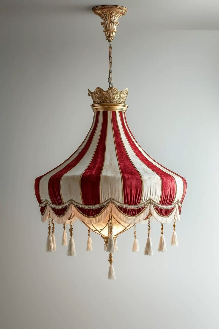 В интерьере это выражается через насыщенные цвета (красный, бордовый, золотой, чёрный, иногда изумрудный), бархат и парча (тяжёлые, богатые ткани), полоски (красно-белые, чёрно-белые — как тент шапито), винтажные цирковые элементы (постеры, маски, реквизит), драматичное освещение (люстры с подвесками, бра, свечи), золото и латунь (рамы, фурнитура, декор).