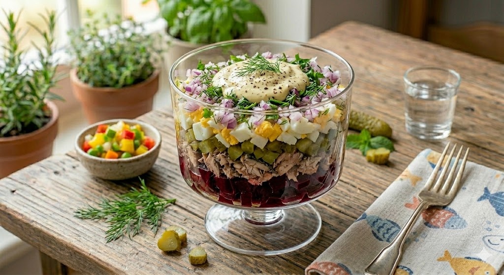 «Этот салат — чемпион по содержанию йода (из рыбы) и клетчатки (из свеклы). Соленый огурец здесь выступает как пробиотик, помогающий пищеварению. Это отличный полноценный ужин, который надолго дает чувство сытости».