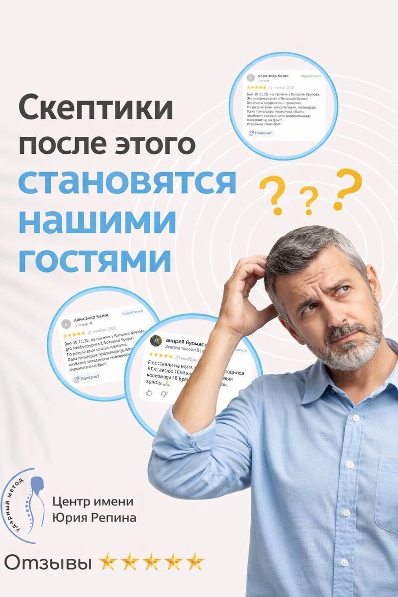 ?🤔 Потому что в вопросах, связанных со здоровьем, человек редко опирается на обещания, гораздо чаще он ищет подтверждение в чужом опыте, стараясь понять, насколько результат может быть реальным именно для него. Сначала возникает сомнение. Затем сравнение. Человек читает, анализирует, ищет несоответствия, пытается уловить, где может быть преувеличение. И именно на этом этапе он сталкивается с повторяющимися формулировками: — «не мог наклониться — стало легче» — «боль уменьшилась прямо во время приёма» — «не верил, но результат почувствовал» Когда подобные наблюдения повторяются не один раз, а десятки раз, скепсис постепенно сменяется интересом, потому что логика становится сильнее сомнений. Отзывы в этом случае перестают восприниматься как субъективное мнение и начинают формировать представление о закономерности результата. И именно в этот момент человек принимает решение прийти. Листайте, там не обещания, а опыт людей 👍🏻 Посмотреть еще отзывы👇🏻 #отзывы@yurirepin
