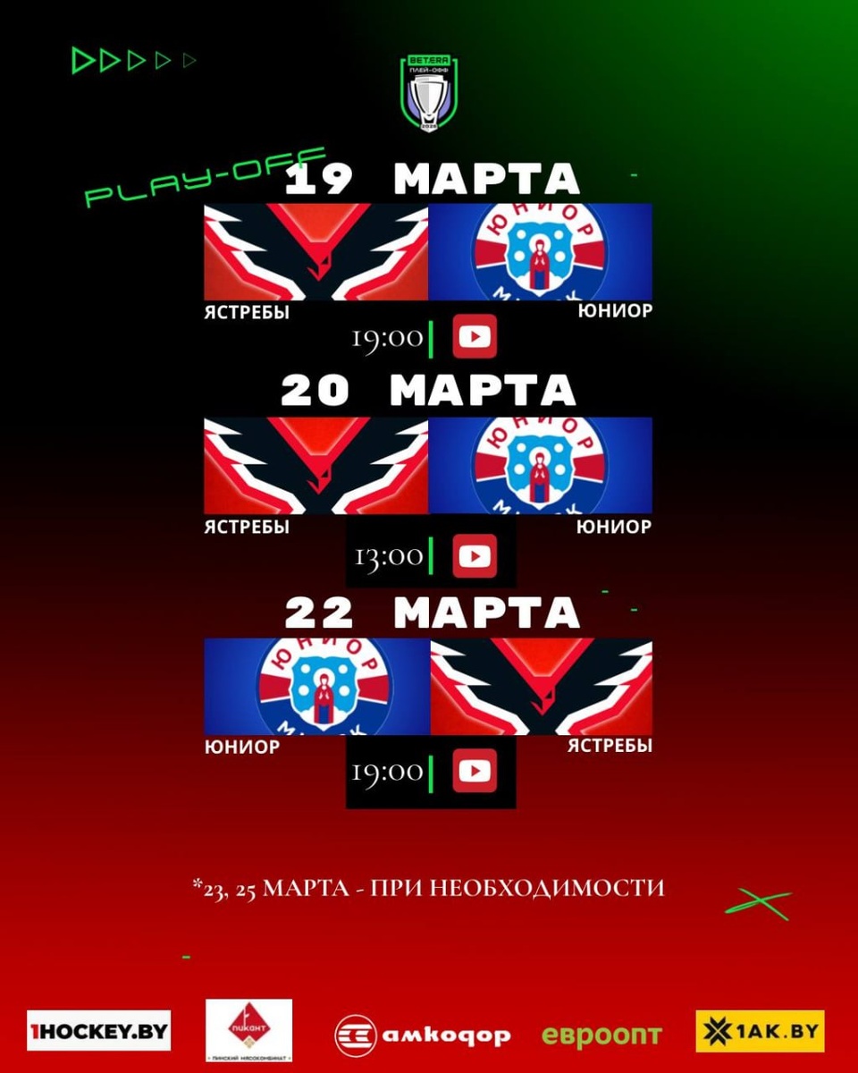 ➡️«Ястребы» проведут два домашних матча: 19 и 20 марта они встретятся с минским «Юниором». Игры состоятся в 19.00 и 13.00 соответственно, 22 марта – на выезде в Минске в 19.00. 23, 25 марта – при необходимости. Напомним, серии матчей 1/4 финала проводятся до трех побед, максимальное количество игр – пять. Первые два матча и, в случае необходимости, пятый проводятся в спортивном сооружении клуба, чья команда имеет более высокий номер «посева» в паре. Команда, проигравшая в серии, прекращает свое участие в плей-офф. ➡️Приходите поболеть за свою команду! Билеты уже в продаже. @Пинский Вестник 📱Ютуб 📱ВК 📱ИНСТАГРАМ 📱ОК 📱ФЕЙСБУК 📱ТИК ТОК Прислать новость