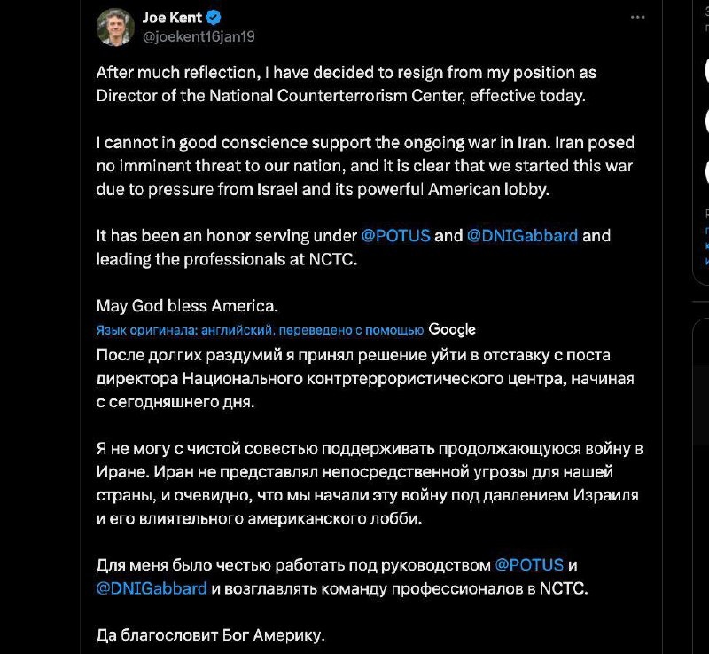 Джо Кент, который находился в должности с июля 2025 года, официально подал прошение об отставке. Он объяснил своё решение несогласием с политикой Трампа и атаками США на Иран. 🔴 Читайте Sputnik Беларусь в MAX