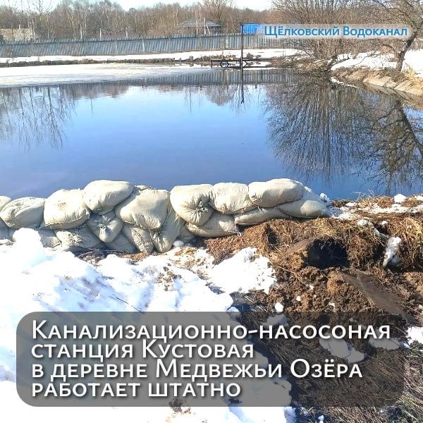 Собственники земельных участков по ул. Радужная в Медвежьих Озерах всполошились: к ним пришла большая вода. Талые воды подтопили земельные участки, гаражи, подвалы и теперь по грунтовой дороге подбираются к домам. Первое, на что подумали жители – о сбоях в работе КНС. По информации службы эксплуатации сооружений ООО «Щёлковский Водоканал», в последние дни КНС "Кустовая", расположенная в районе ул. Радужная, работает в круглосуточном режиме на полную мощность, осуществляя транспортировку хозяйственно-бытовых стоков на очистные сооружения. Отключений насосов, и тем более изливов стоков внутри помещений и за пределами станции не замечено. Подтопления территории вокруг КНС случались и ранее - ул. Радужная расположена в понижении рельефа. Вместе с тем, для предотвращения нежелательного скопления талых вод на территории КНС и прилегающих участках Водоканал 17 марта провел дополнительные мероприятия по обваловке территории – устройству искусственных насыпей.