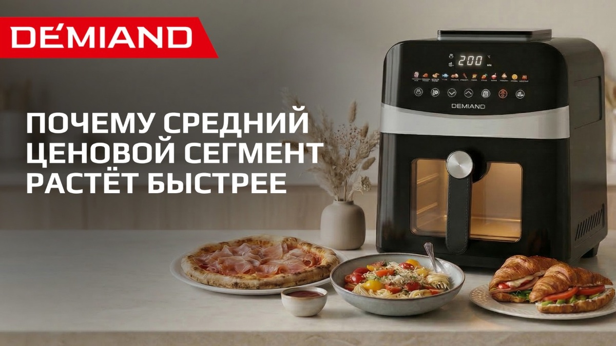 Почему средний ценовой сегмент кухонной техники растет быстрее премиума? Коротко: потому что покупатель стал осознаннее и практичнее. Еще пару лет назад рынок бытовой техники жил по простой логике — «дёшево и сердито» или «дорого и красиво». Сейчас всё сместилось. По данным MegaResearch, в 2024 году основной рост продаж аэрогрилей пришёлся именно на средний ценовой сегмент. И это не случайность — это новая модель потребления. После ухода ряда зарубежных брендов в 2022 году рынок перестроился. Российские производители заняли освободившиеся ниши — и не просто заполнили полки, а предложили продукт, который раньше был доступен только в премиуме: Wi-Fi-управление, гибкие программы, встроенные рецепты. Только по адекватной цене. Параллельно выросла электронная торговля — продажи бытовой техники через маркетплейсы увеличились примерно на 15%. Покупатель от Калининграда до Владивостока получил одинаковый доступ к ассортименту. А значит — возможность сравнивать, выбирать и не переплачивать за л